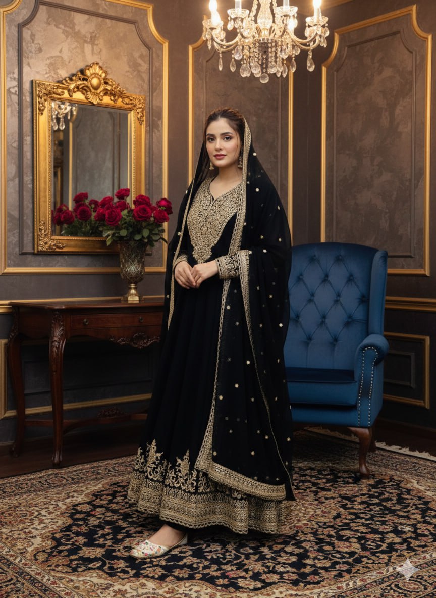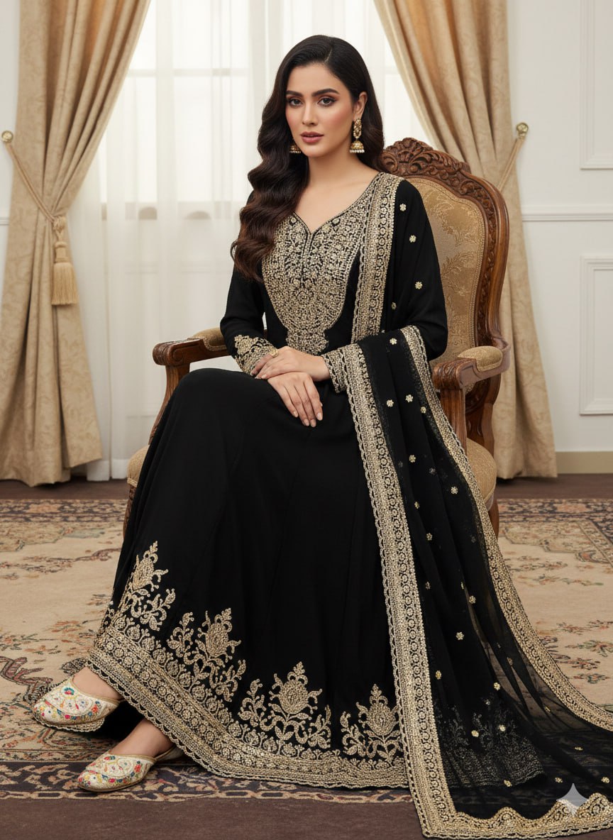 PREMIUM QUALITY EMBROIDERED GOWN SET Elegant and sophisticated gown set in luxurious Blooming Faux Georgette featuring heavy embroidery and sequence...