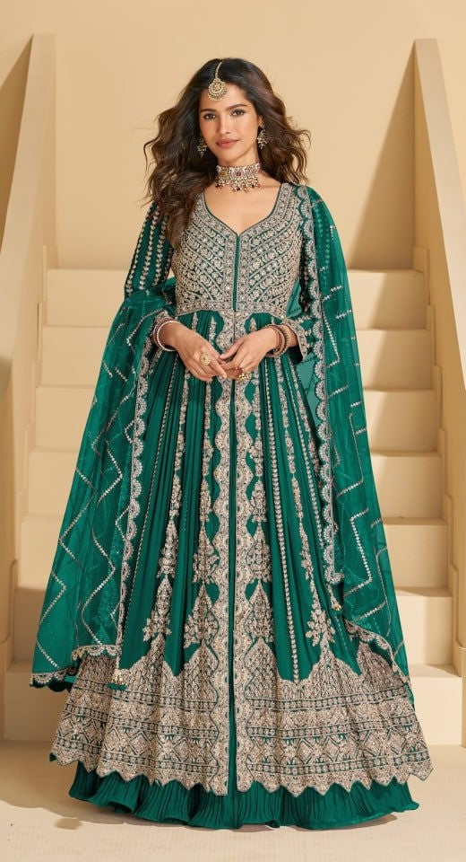Elevate your ethnic wardrobe with this stunning designer Chinon ensemble that seamlessly blends tradition with contemporary elegance. Crafted from premium...