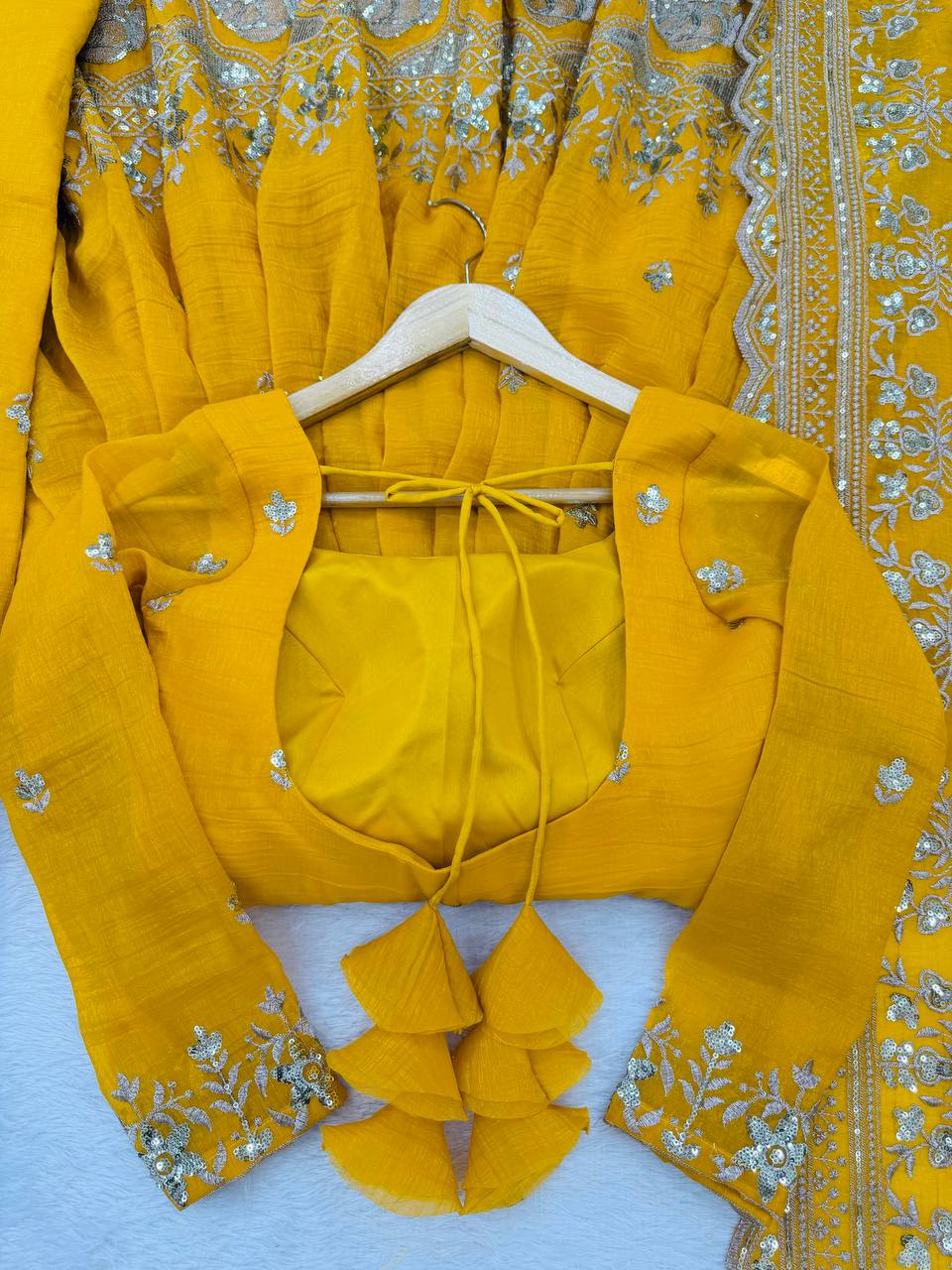 Designer heavy crunchy silk Anarkali set with sequin and thread embroidery. Includes micro inner lining, embroidered pant, and 2.2m dupatta....