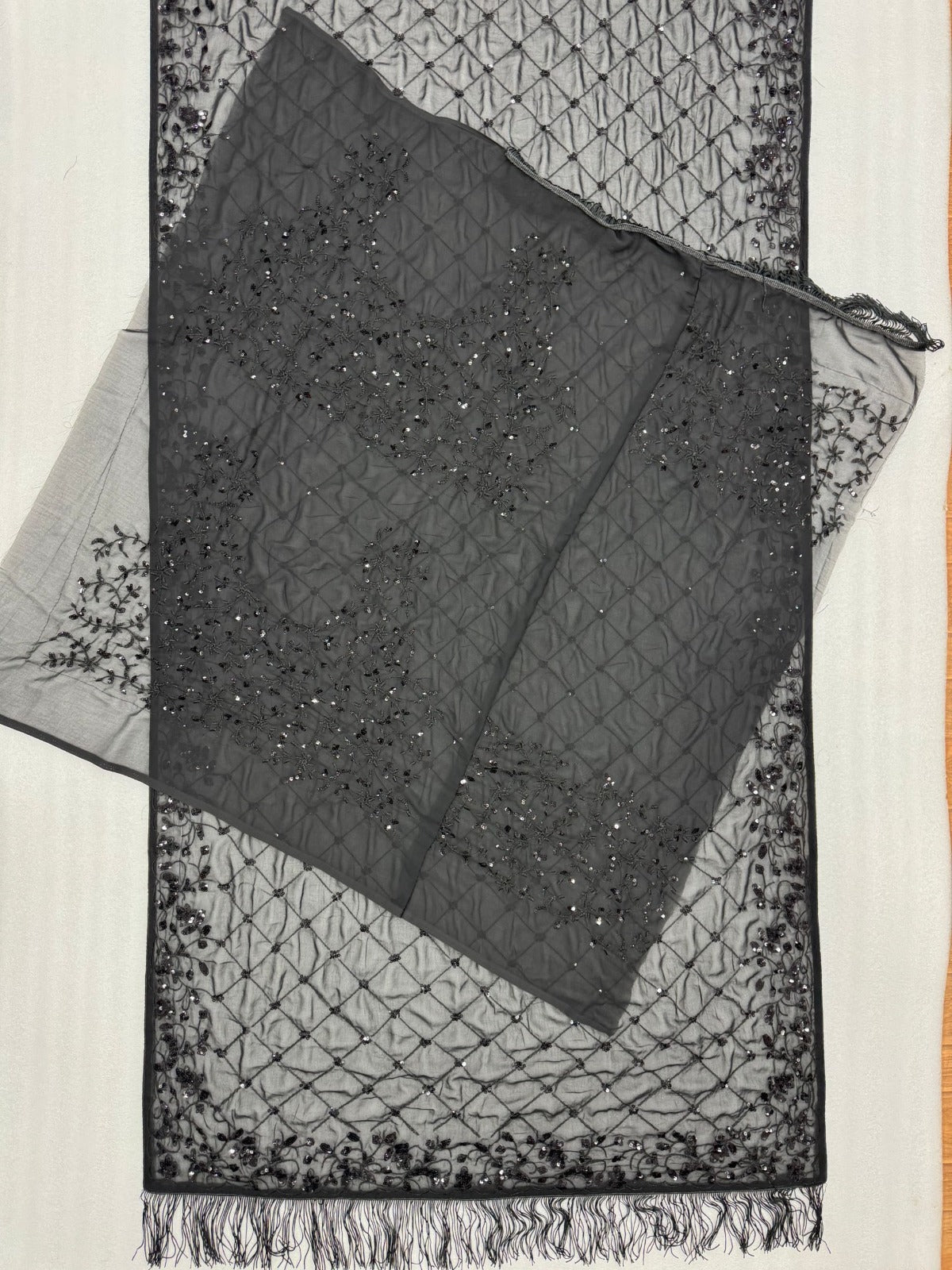 Luxurious faux georgette saree featuring heavy pallu embroidery with 5mm sequins and multi-embroidery work. Includes matching designer blouse with front...