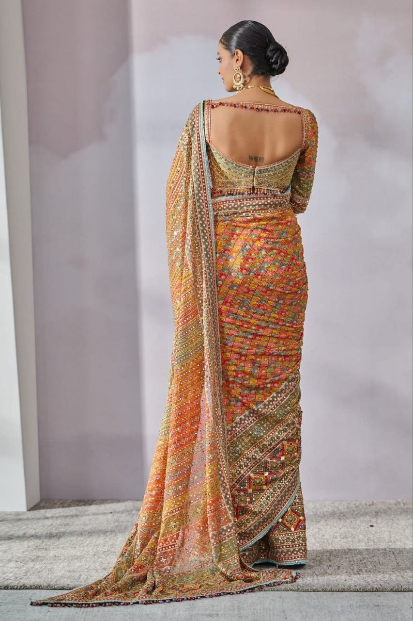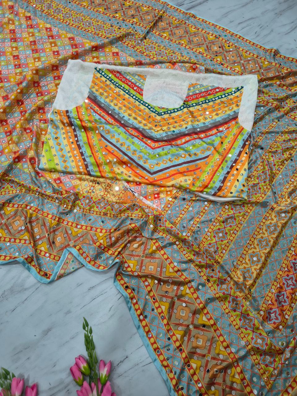 Premium Chinon Silk Saree With Beautiful Print And Mirror Work All Over With Lace On Pallu