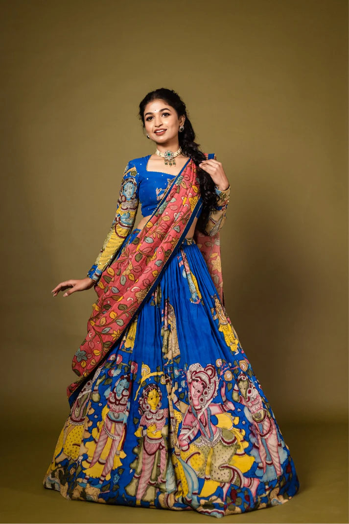 Premium Indigo Tussar Silk Lehenga Choli With Kalamkari Print
