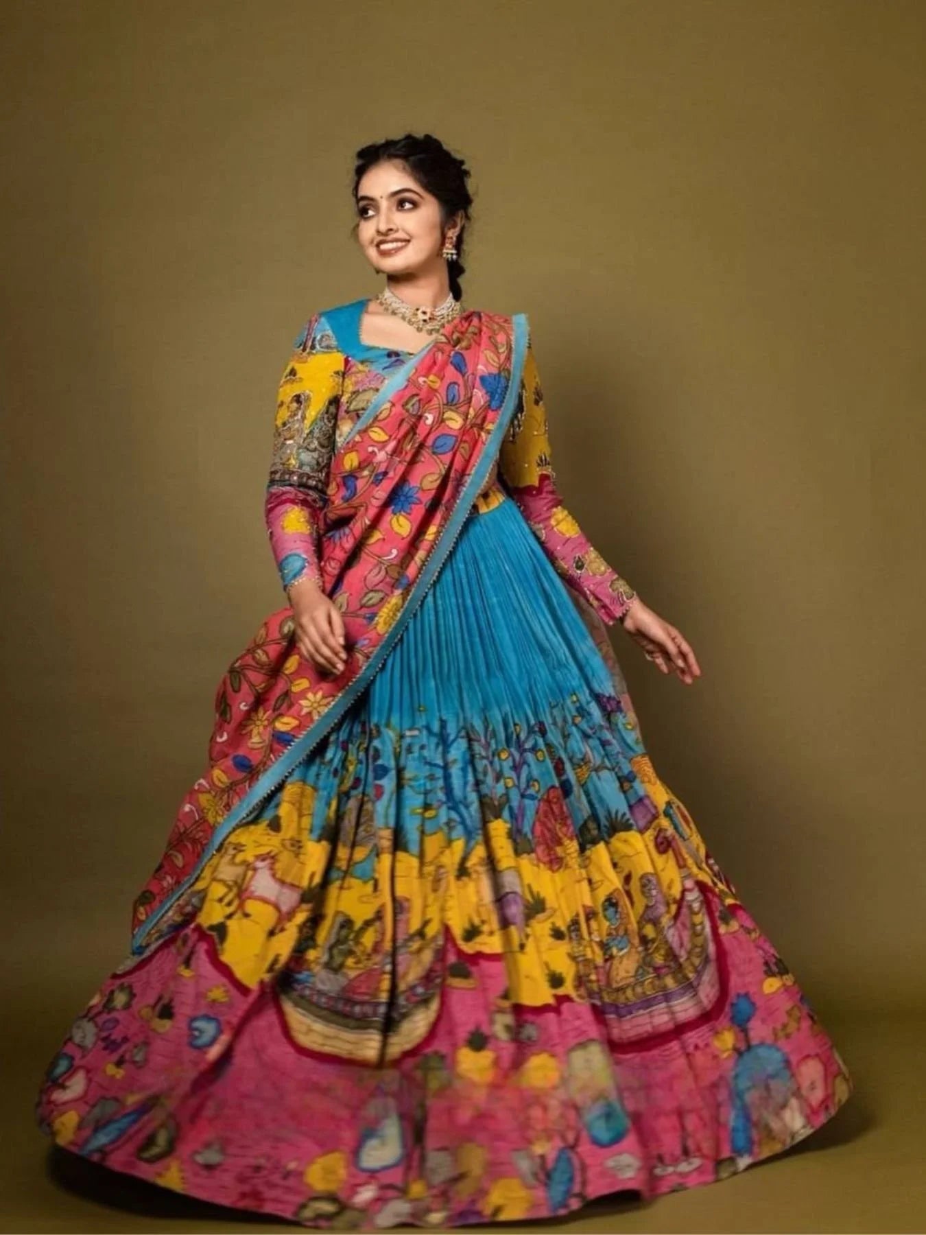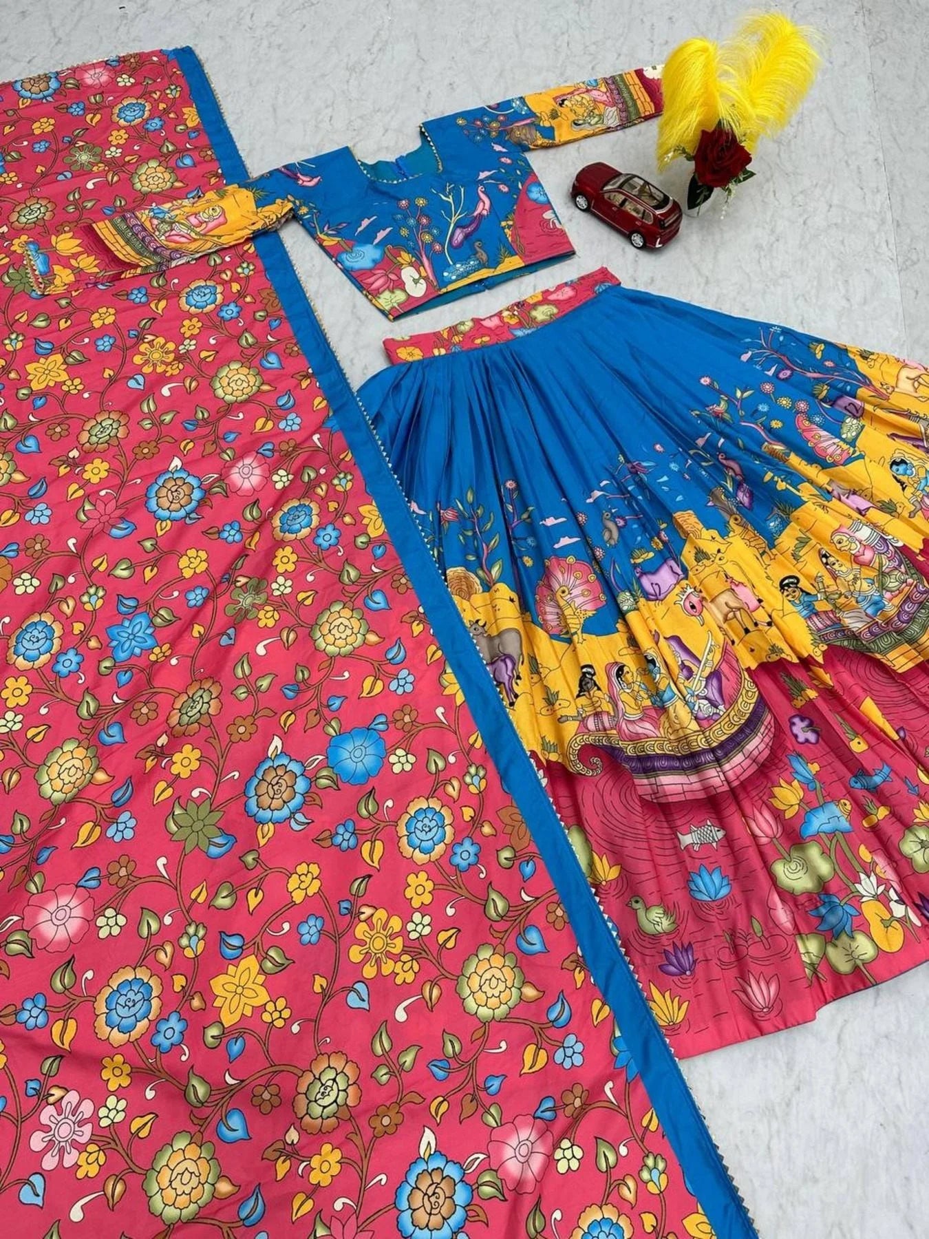 Premium Light Blue Tussar Silk Lehenga Choli With Kalamkari Print