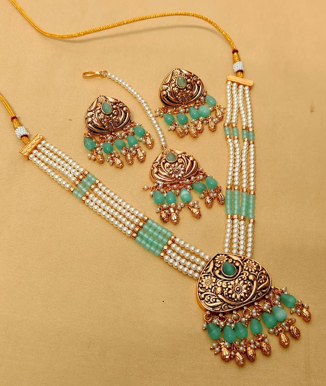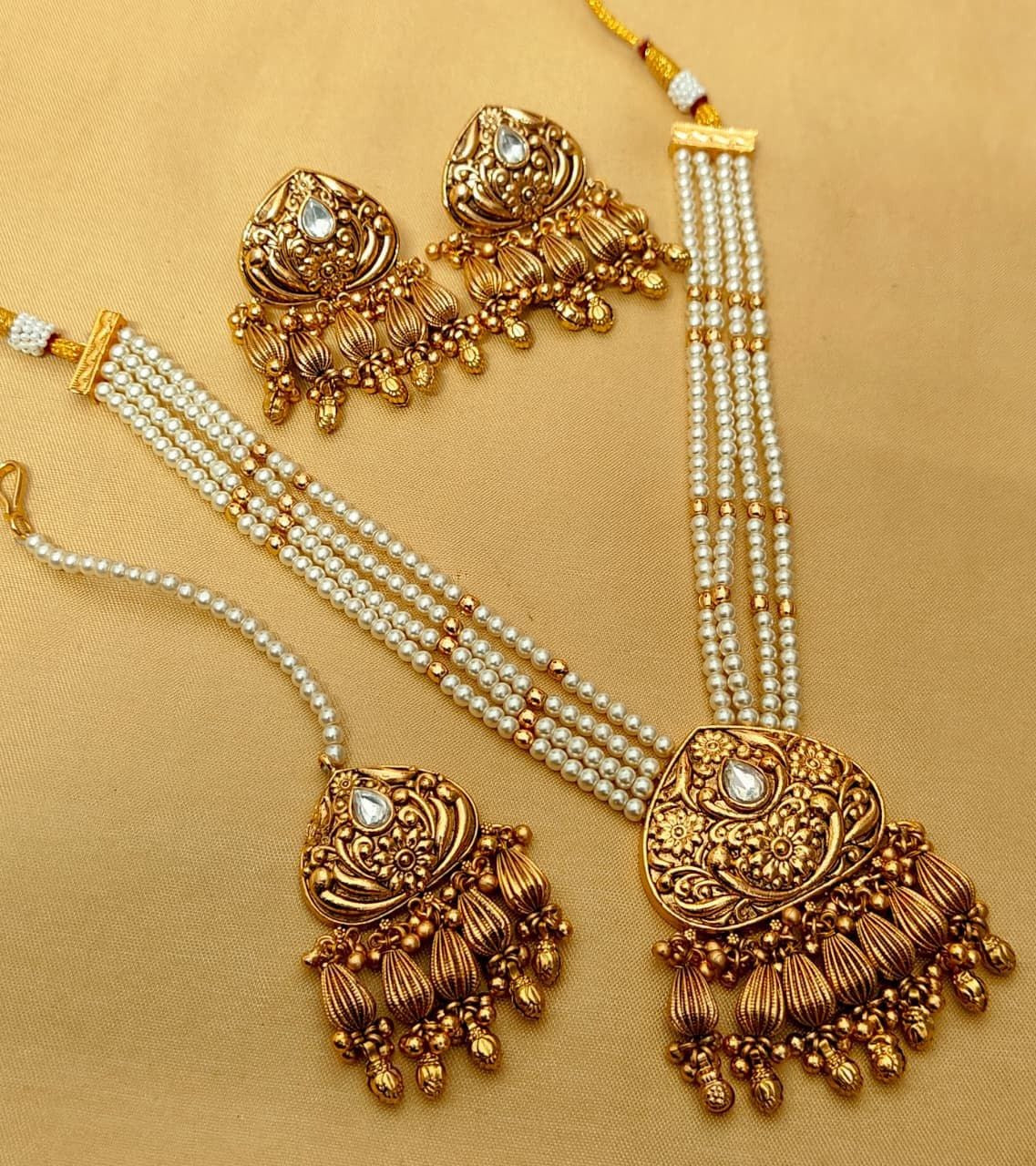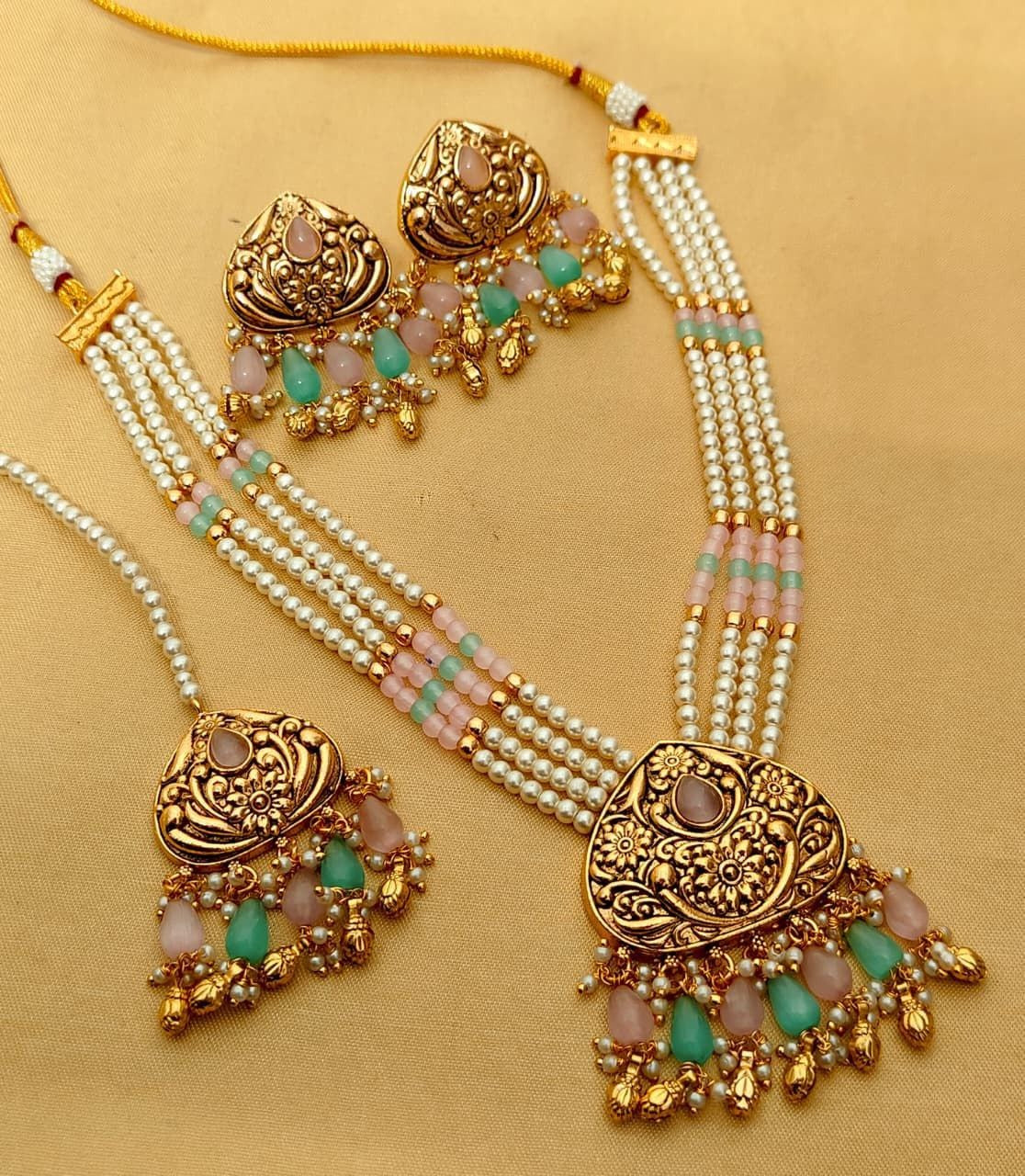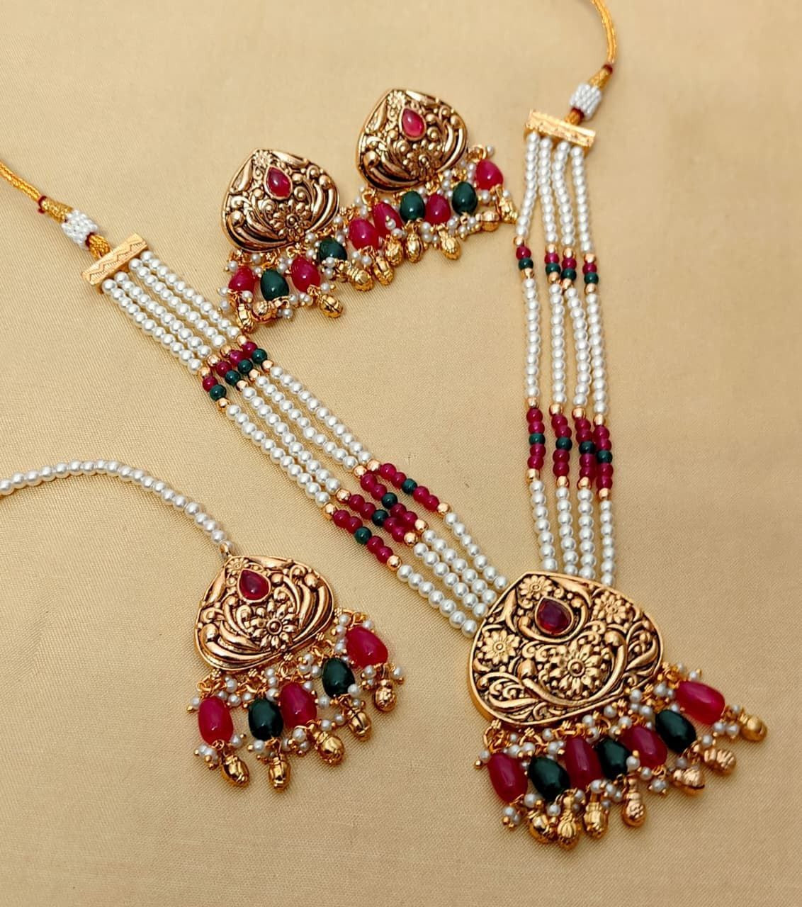 Premium Matt Gold Polish Necklace Set with Pearls & Multi-Stone Detailing With Earrings and Maang Tikka