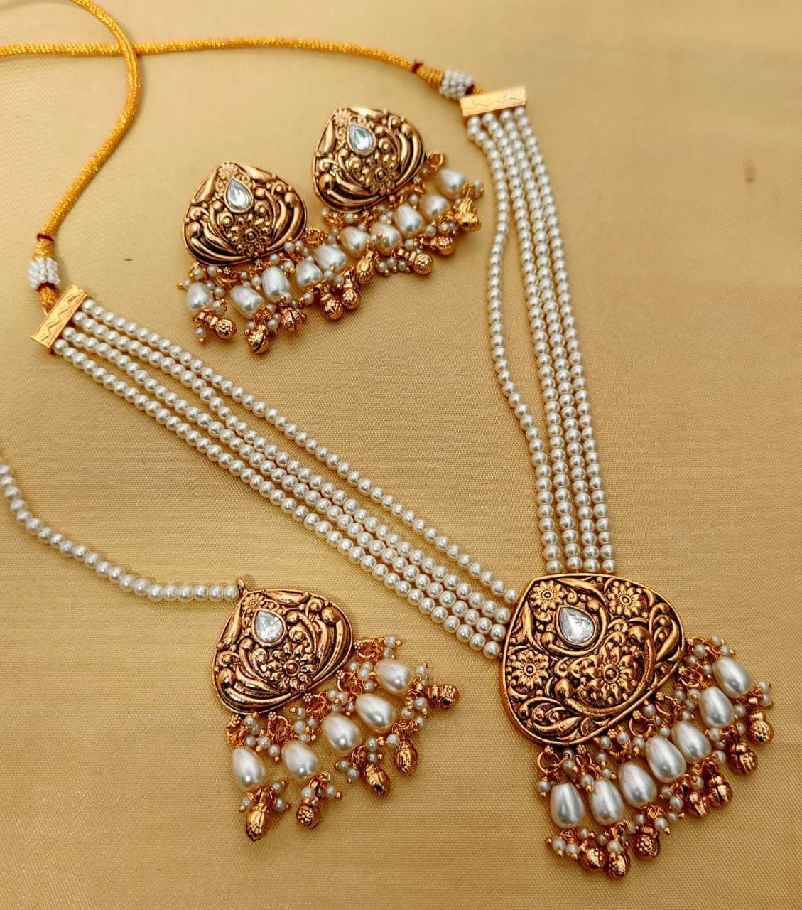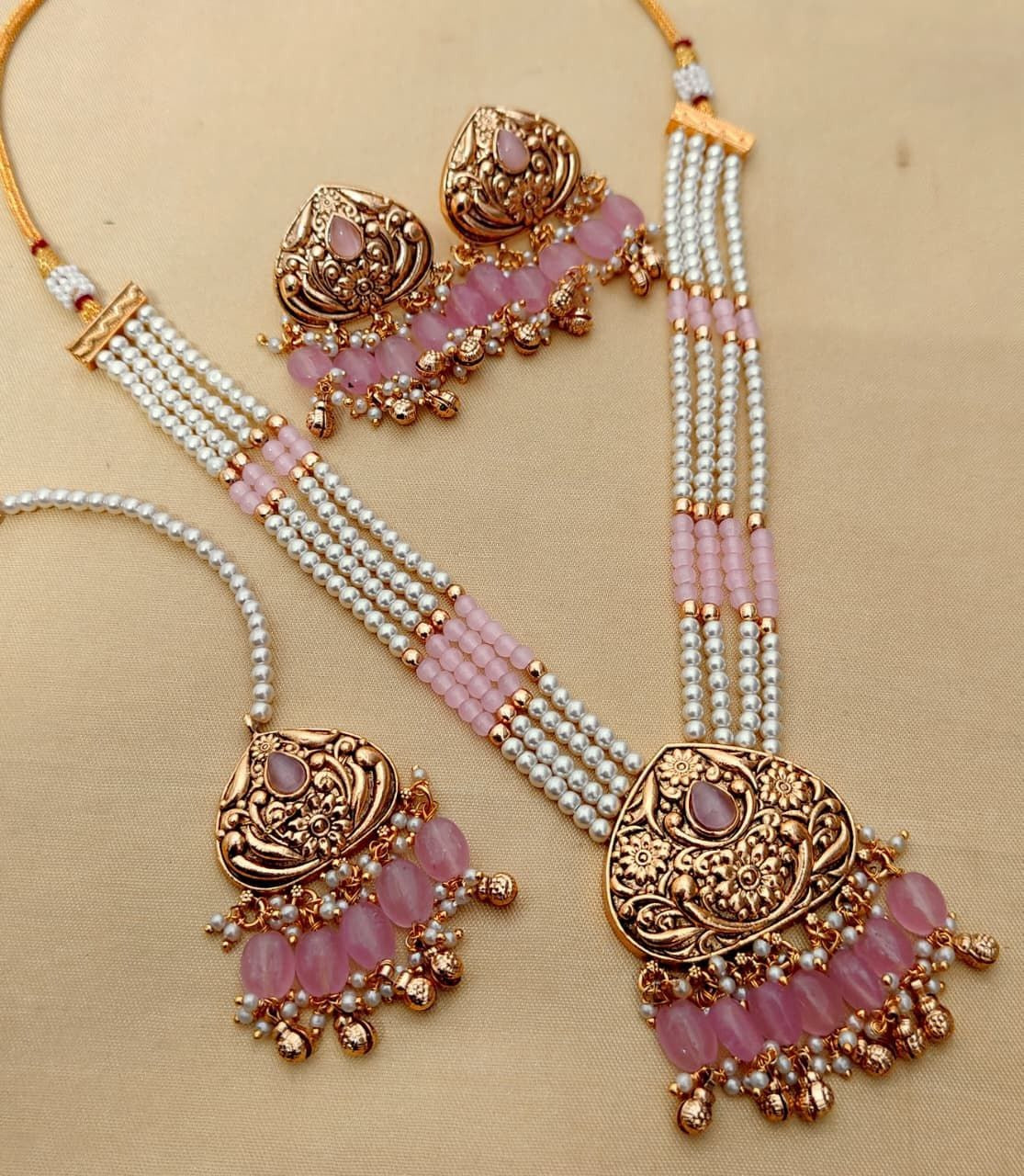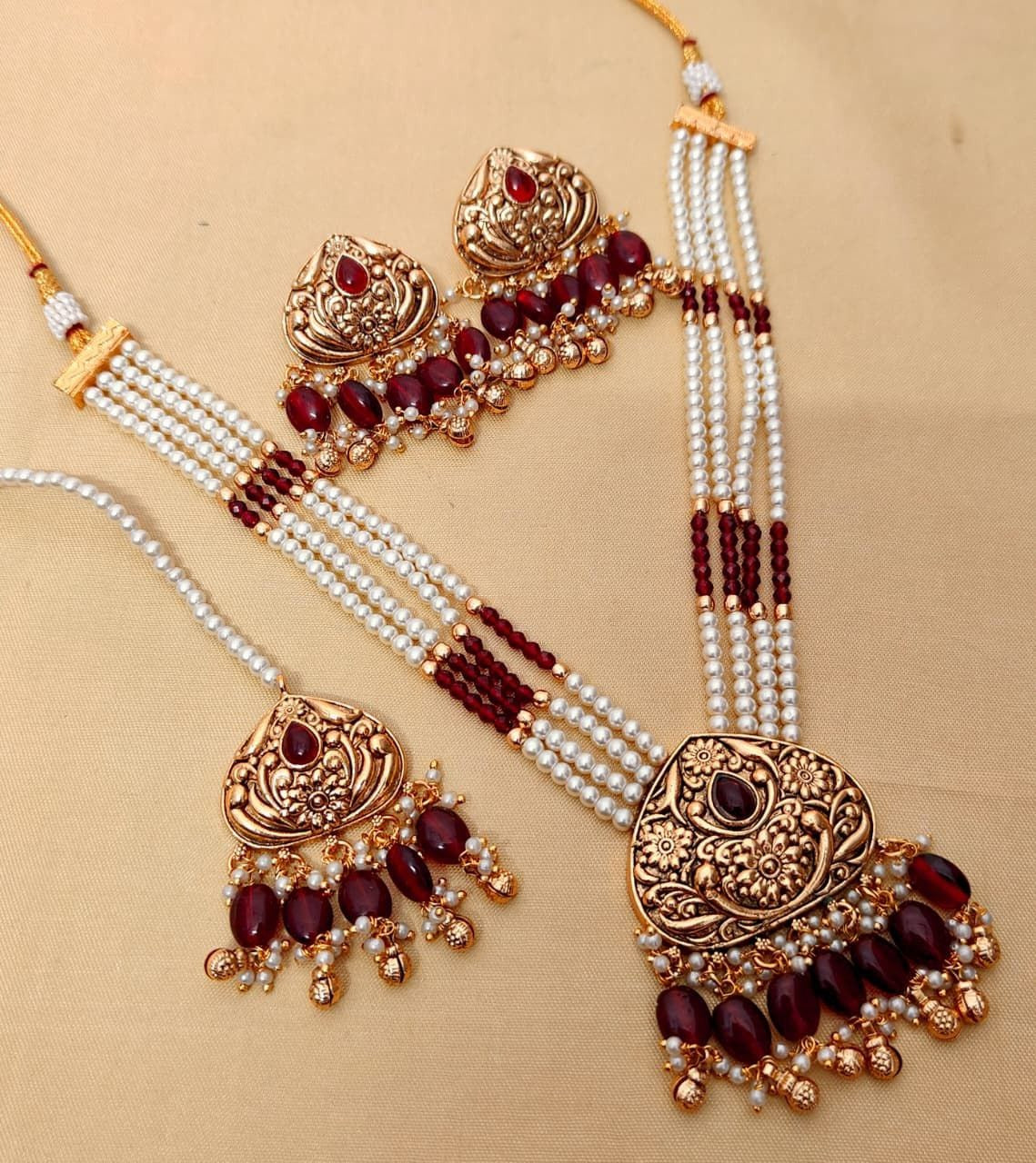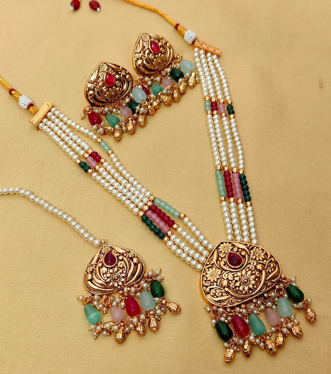 Premium Matt Gold Polish Necklace Set with Pearls & Multi-Stone Detailing With Earrings and Maang Tikka