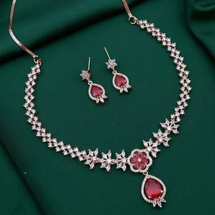 Premium Rose Gold AD Necklace Set with Ruby-Red Pendant & Matching Earrings