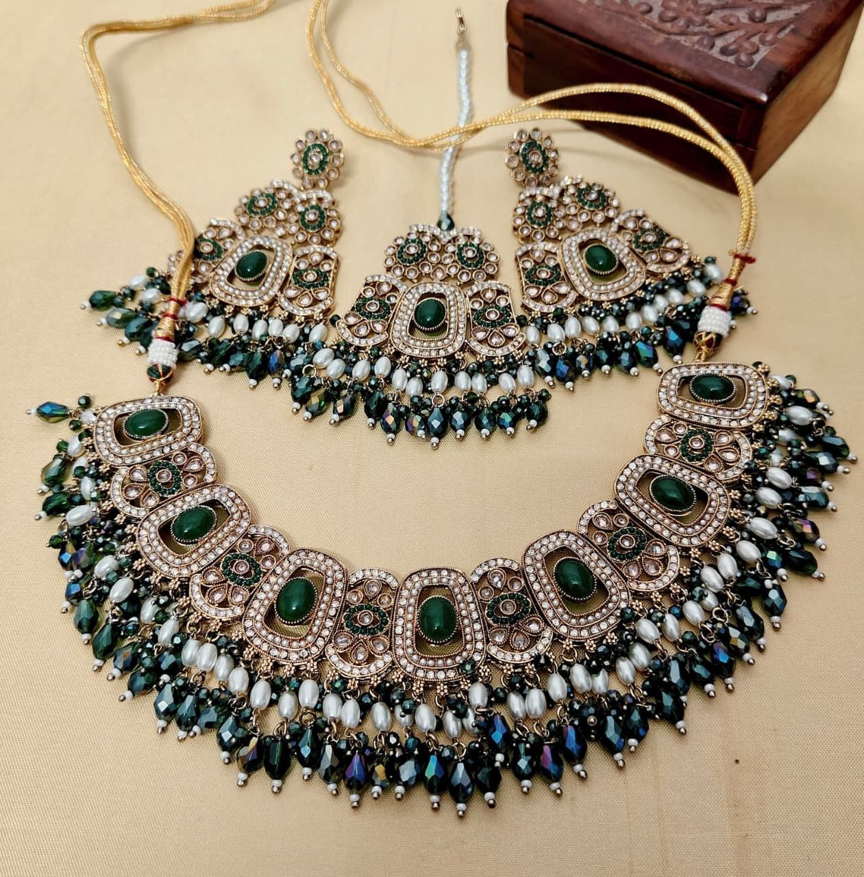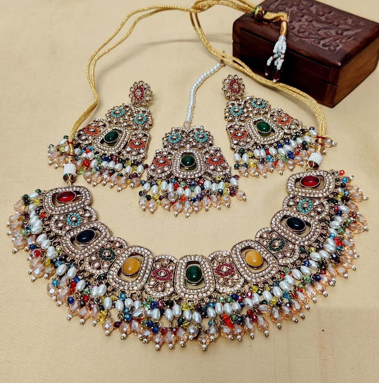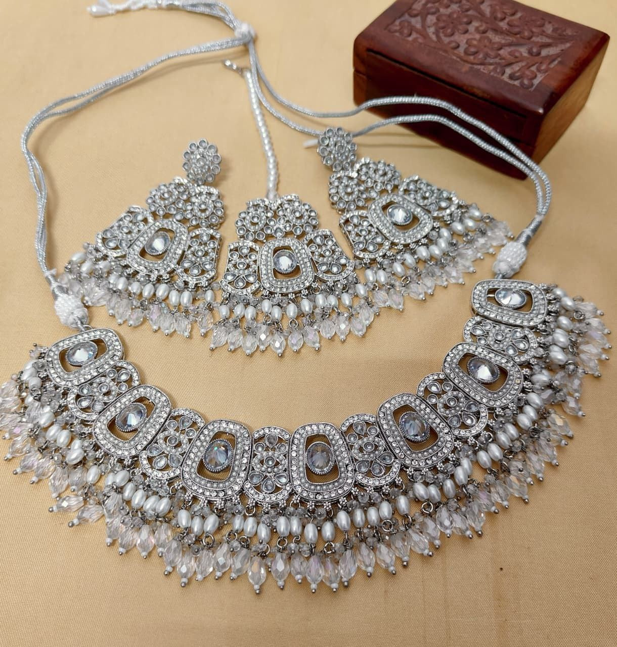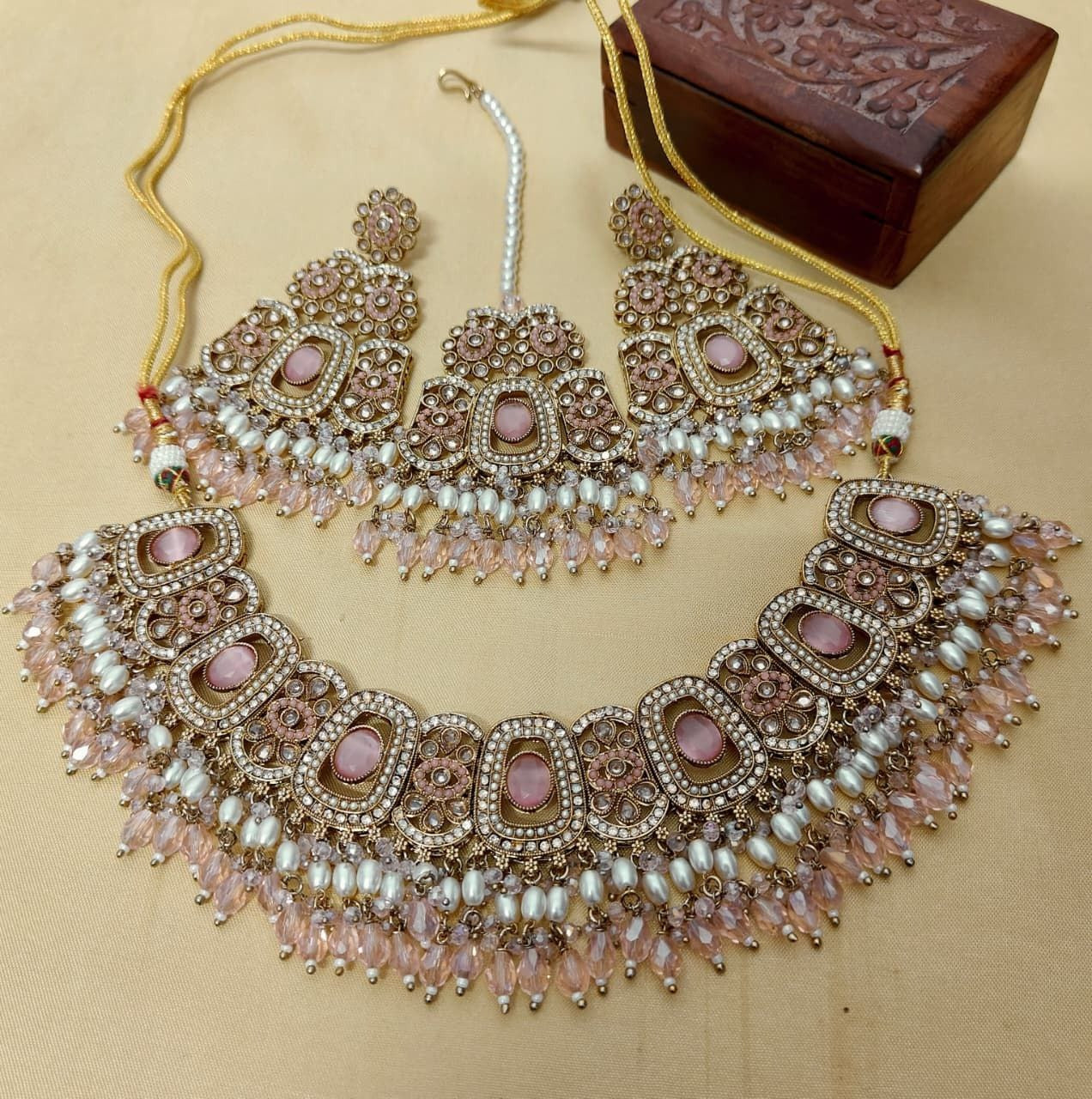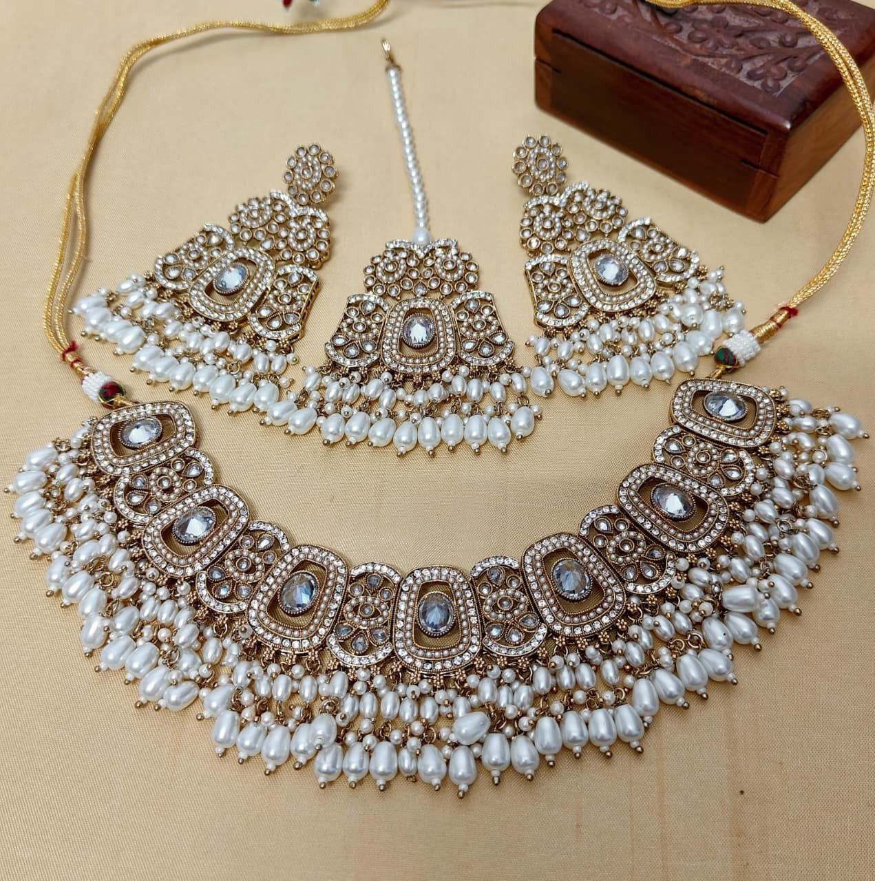 Beautiful premium quality reverse AD stone work choker with big size statement earrings and matching tika. Handcrafted luxury jewelry perfect...