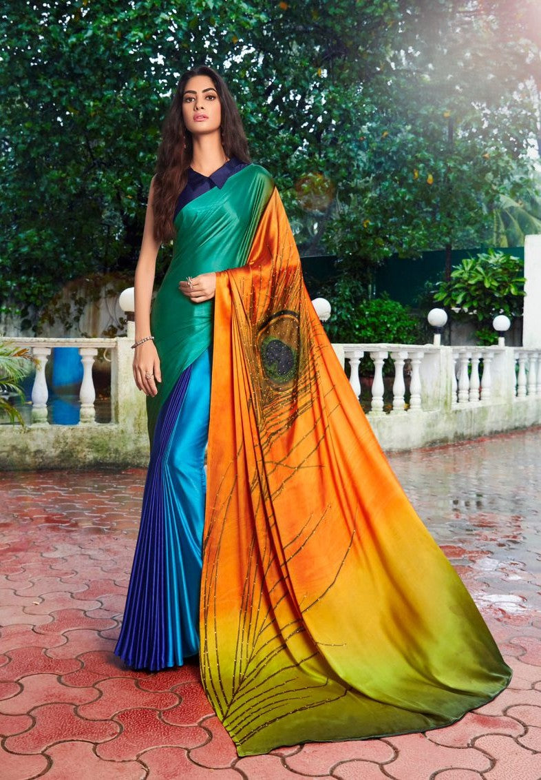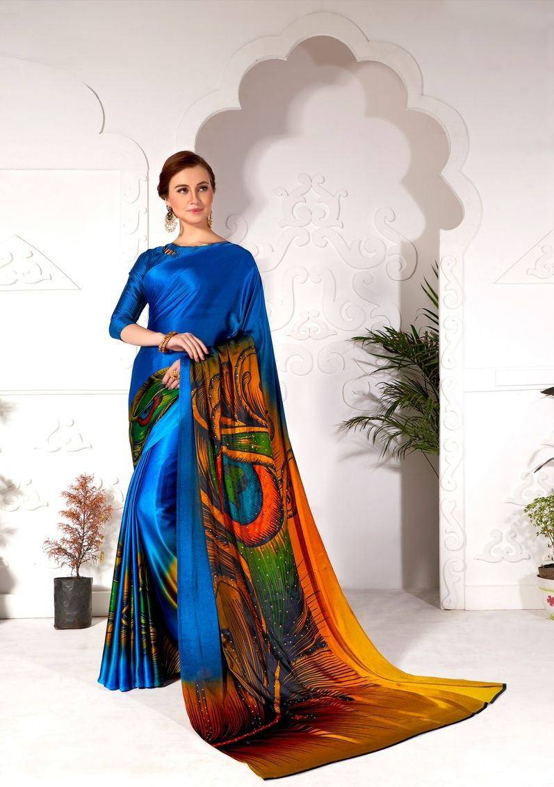 Fabric Details Saree: Premium satin silk with exclusive hand print and stone diamond work Experience the perfect blend of traditional...