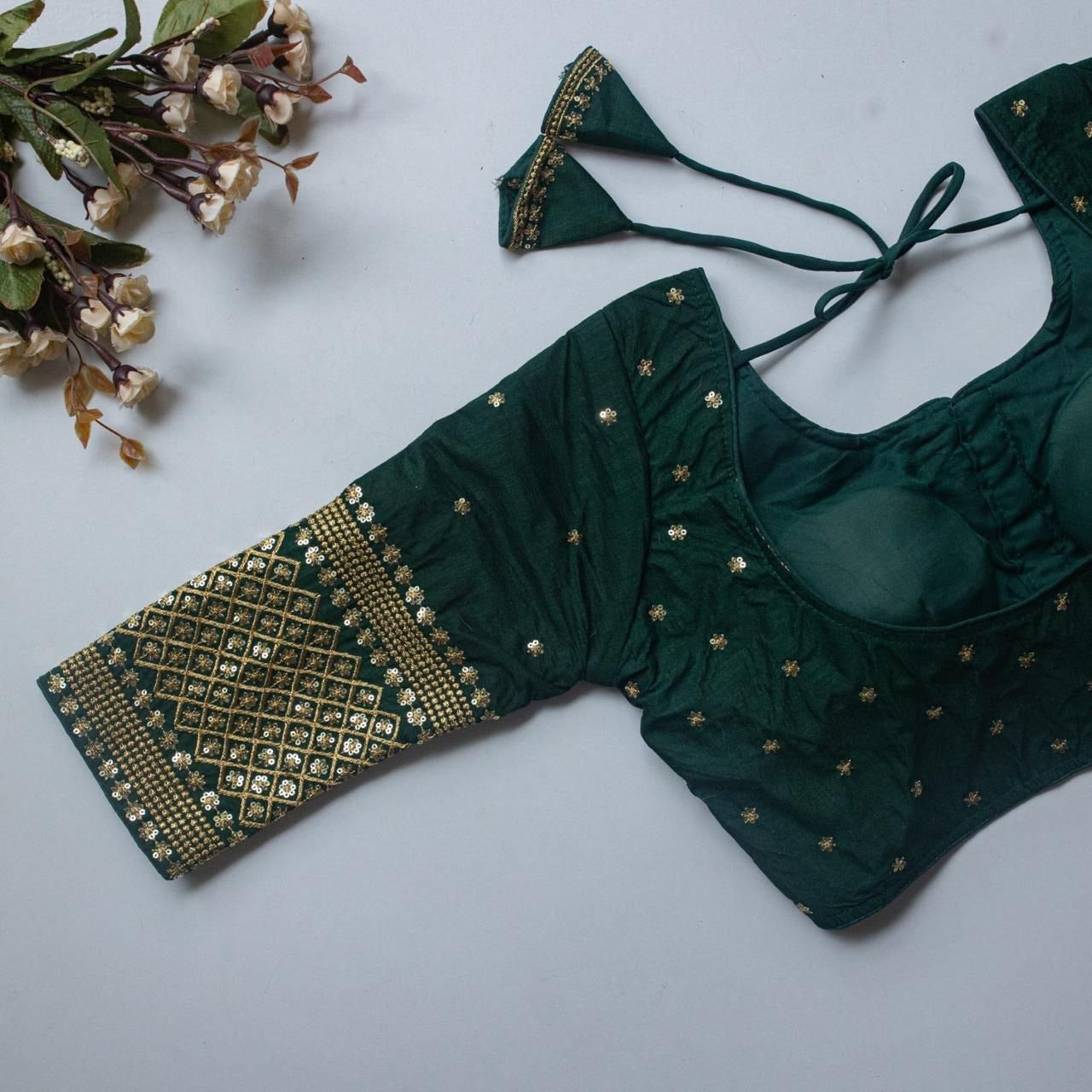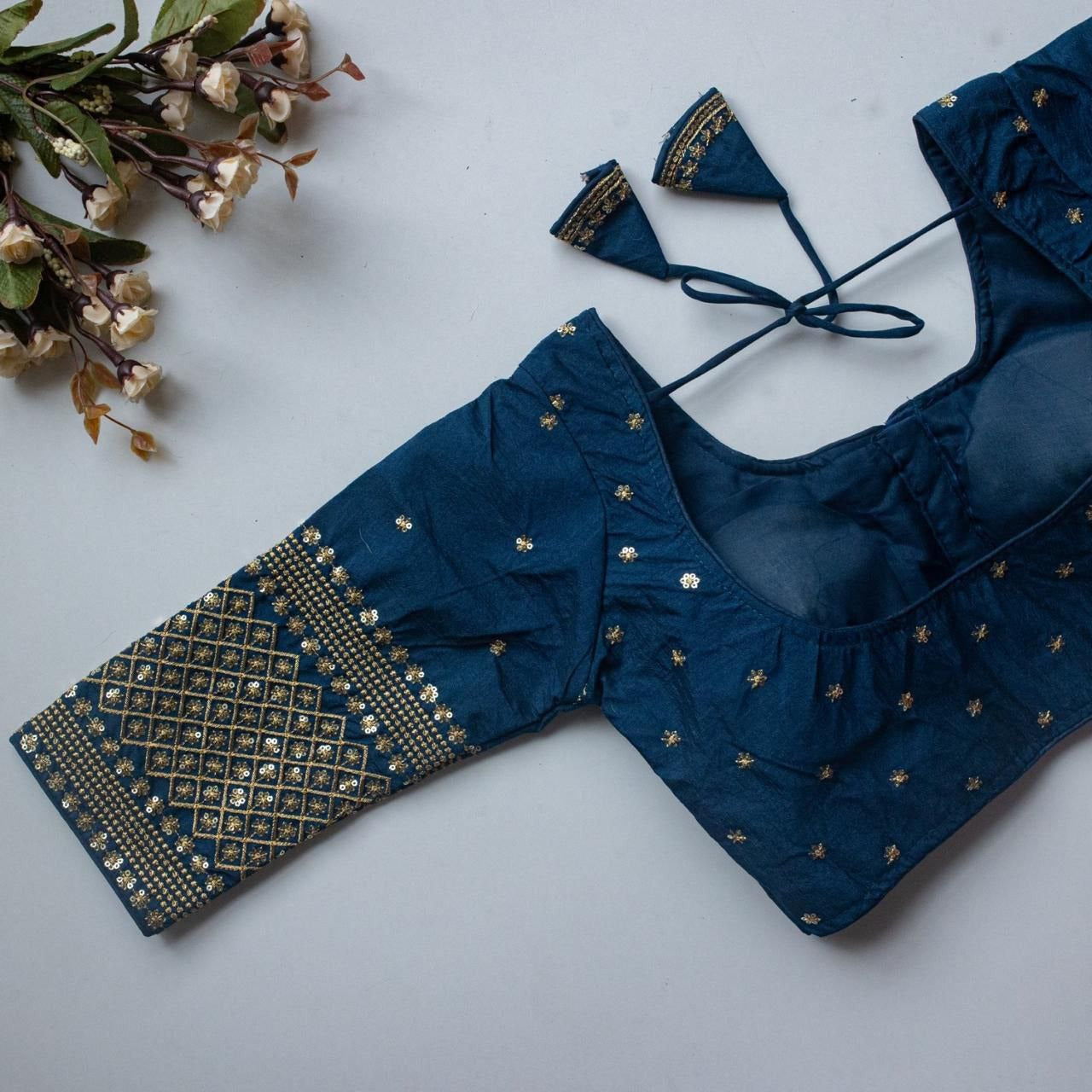 Designer Vichitra silk readymade blouse with embroidery zari and sequin work. V-neck, 3/4 sleeves, cotton lining, padded. Front hook opening...
